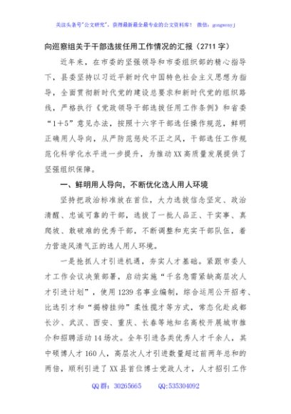 / 向巡察组关于干部选拔任用工作情况的汇报