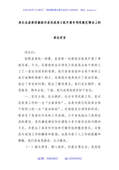 / 局长在县委巡察组对县民政局X组开展专项巡察反馈会上的表态发言