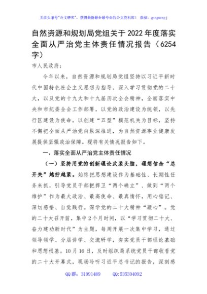 / 自然资源和规划局党组关于2022年度落实全面从严治党主体责任情况报告