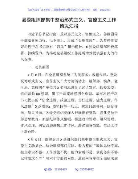 组织部集中整治形式主义、官僚主义工作情况总结汇报