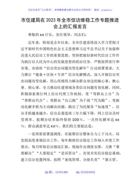 / 市住建局在2023年全市信访维稳工作专题推进会上的汇报发言