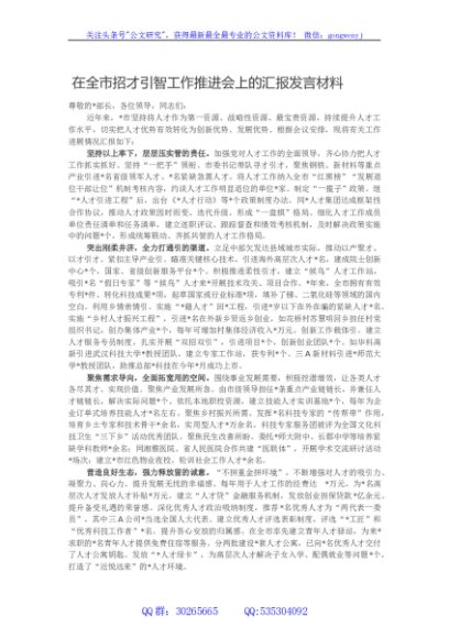 / 在全市招才引智工作推进会上的汇报发言材料