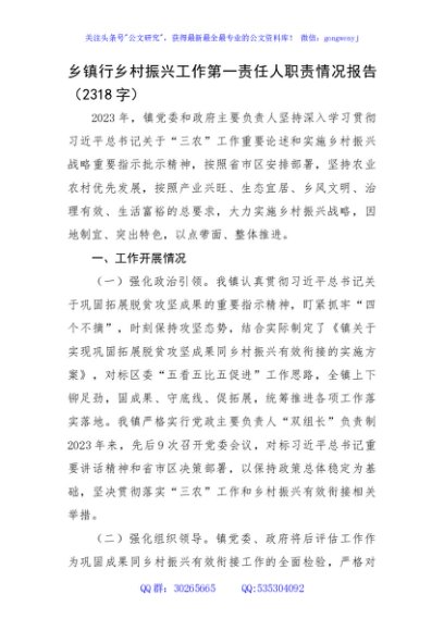 乡镇行乡村振兴工作第一责任人职责情况报告