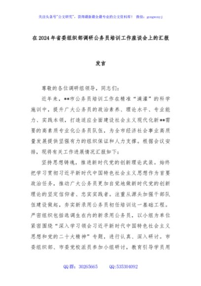 / 在2024年省委组织部调研公务员培训工作座谈会上的汇报发言