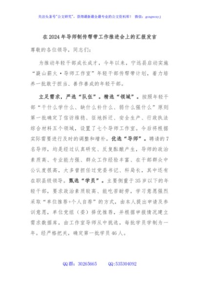 / 在2024年导师制传帮带工作推进会上的汇报发言