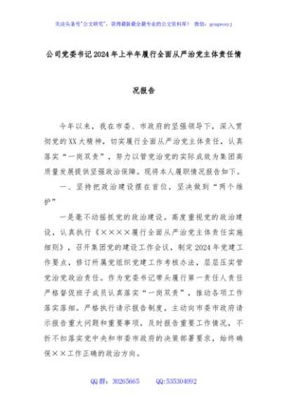 / 公司党委书记2024年上半年履行全面从严治党主体责任情况报告