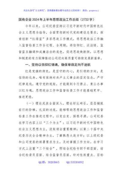 / 国企2024年上半年思想政治工作总结(2722字)