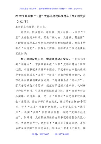 / 在2024年全市“五星”支部创建现场推进会上的汇报发言(1402字)