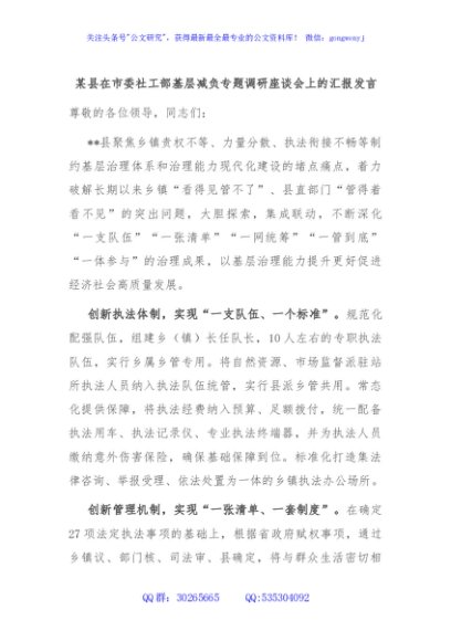 / 某县在市委社工部基层减负专题调研座谈会上的汇报发言
