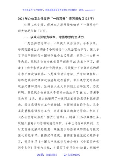 / 2024年办公室主任履行“一岗双责”情况报告(3132字)