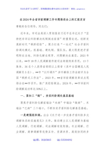/ 在2024年全省诉前调解工作专题推进会上的汇报发言