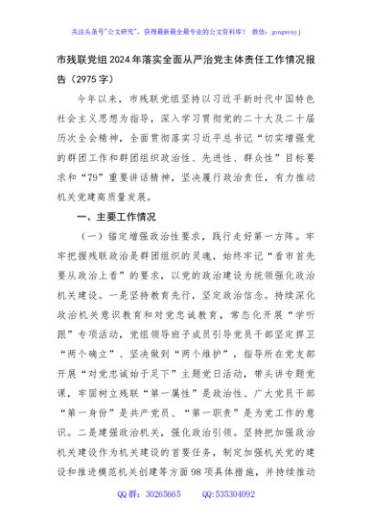 / 市残联党组2024年落实全面从严治党主体责任工作情况报告(2975字)