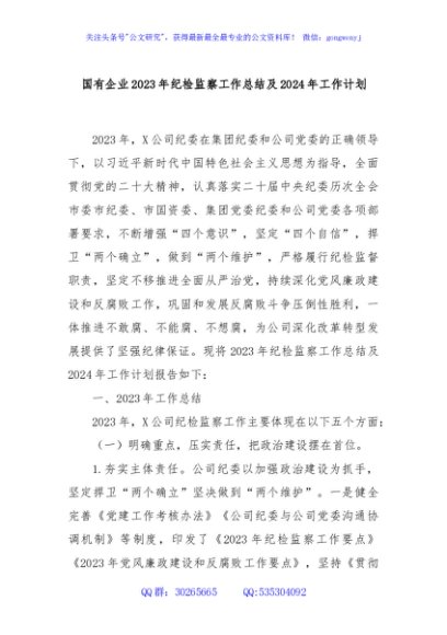 / 国有企业2023年纪检监察工作总结及2024年工作计划