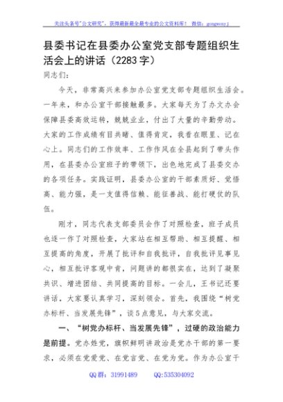 / 县委书记在县委办公室党支部专题组织生活会上的讲话