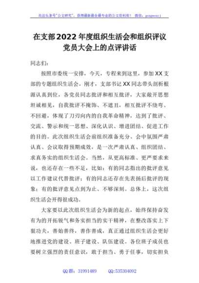 / 在支部2022年度组织生活会和组织评议党员大会上的点评讲话