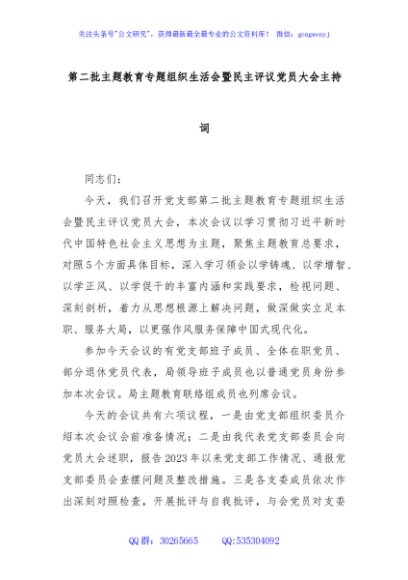 / 第二批主题教育专题组织生活会暨民主评议党员大会主持词