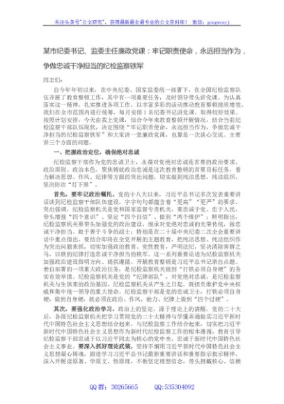 / 某市纪委书记、监委主任廉政党课:牢记职责使命,永远担当作为,争做忠诚干净担当的纪检监察铁军