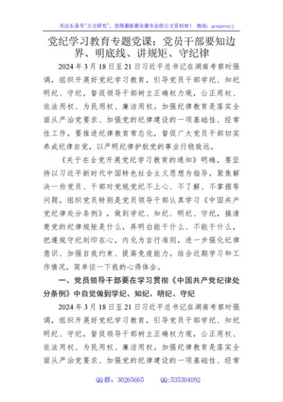 / 党纪专题党课:要知边界、明底线、讲规矩、守纪律(纪检5900字)