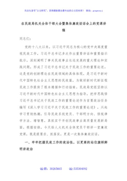 / 在民政局机关全体干部大会暨集体廉政谈话会上的党课讲稿