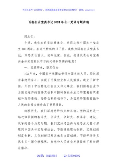 / 国有企业党委书记2024年七一党课专题讲稿