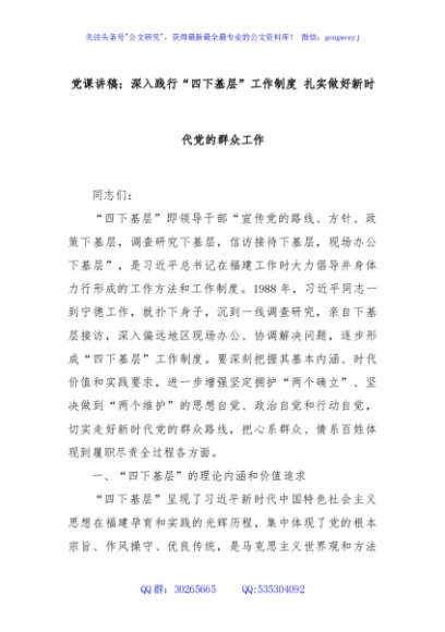 / 党课讲稿:深入践行“四下基层”工作制度 扎实做好新时代党的群众工作