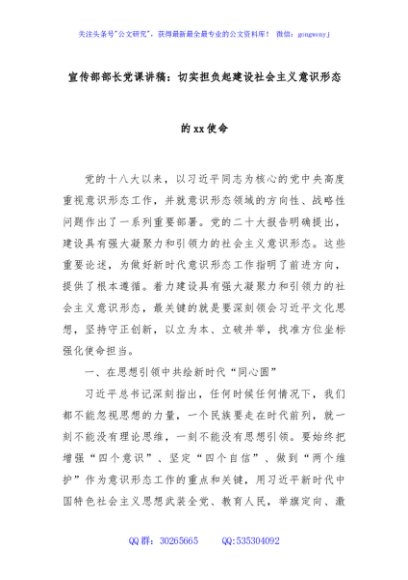 / 宣传部部长党课讲稿:切实担负起建设社会主义意识形态的xx使命