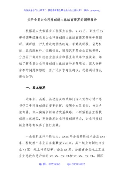 / 关于全县企业科技创新主体培育情况的调研报告