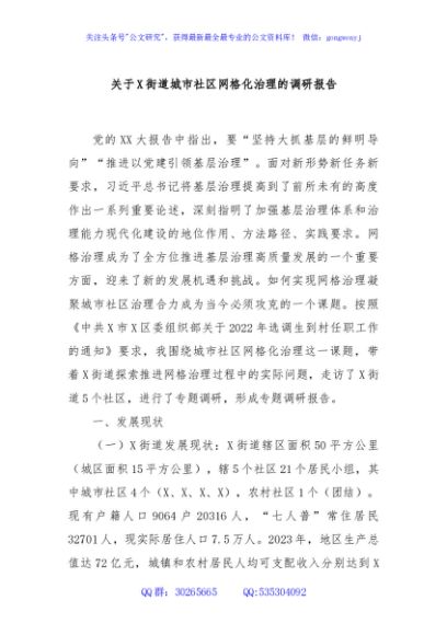 / 关于X街道城市社区网格化治理的调研报告