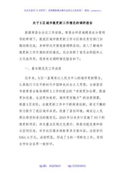 / 关于X区城市微更新工作情况的调研报告