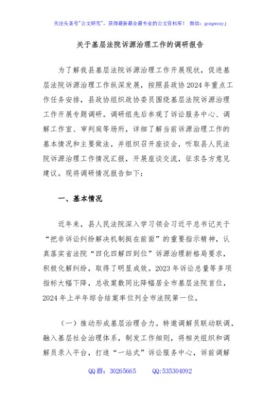 / 关于基层法院诉源治理工作的调研报告