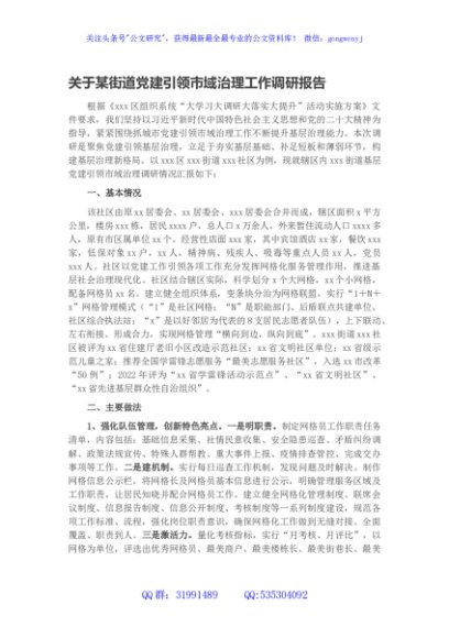 / 关于某街道党建引领市域治理工作调研报告