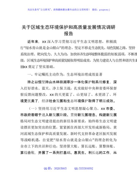 / 区域生态环境保护和高质量发展情况调研报告