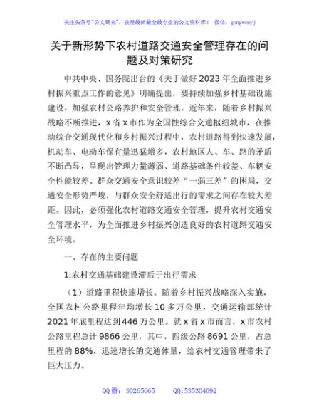 / 新形势下农村道路交通安全管理存在的问题及对策研究(调研报告参考)