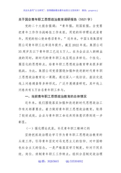 / 国企青年职工思想政治教育调研报告