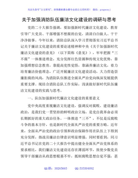 / 加强消防队伍廉洁文化建设的调研与思考(调研报告)