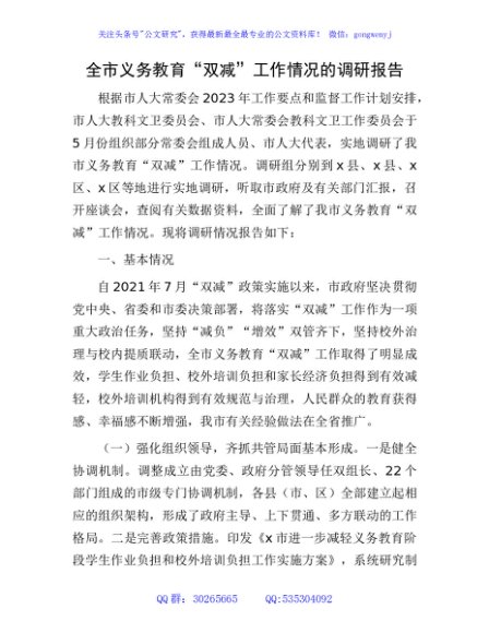 / 全市义务教育“双减”工作情况的调研报告