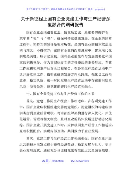 / 新征程上国企公司党建工作与生产经营深度融合的调研报告