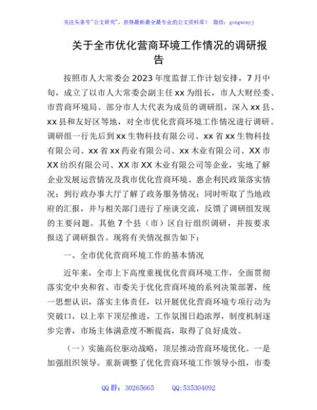 / 全市优化营商环境工作情况的调研报告