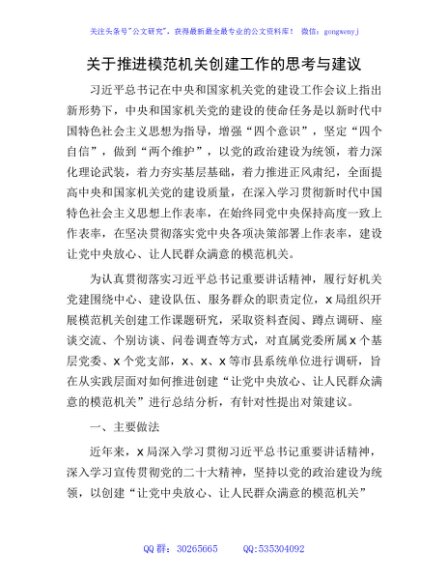 / 推进模范机关创建工作的思考与建议(调研报告参考)