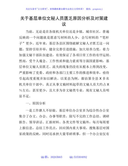 / 基层单位文秘人员匮乏原因分析及对策建议(调研报告参考)