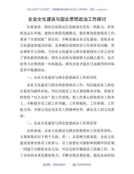 / 企业文化建设与国企思想政治工作探讨(公司调研报告参考)