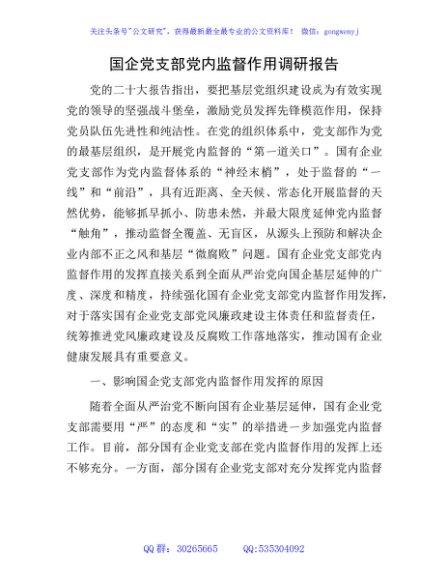 / 国企(公司)党支部党内监督作用调研报告
