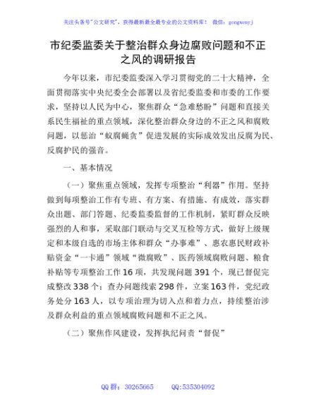 / 市纪委监委关于整治群众身边腐败问题和不正之风的调研报告