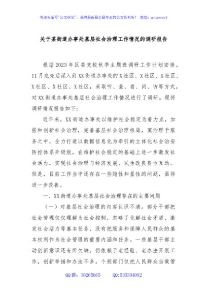 / 关于某街道办事处基层社会治理工作情况的调研报告