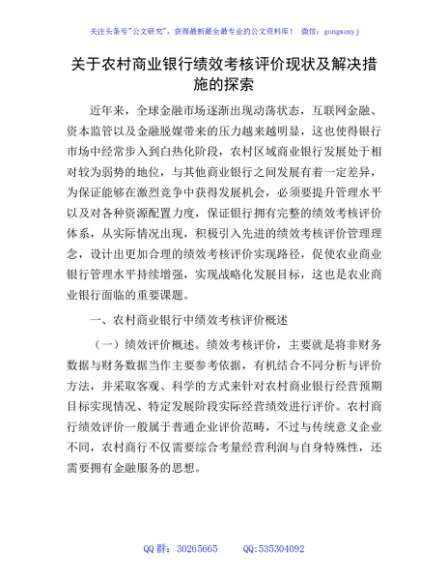 / 农村商业银行绩效考核评价现状及解决措施的探索(调研报告参考)