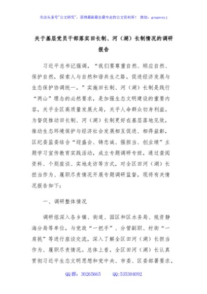/ 关于基层党员干部落实田长制、河(湖)长制情况的调研报告