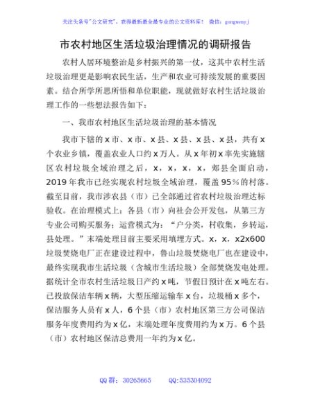 / 市农村地区生活垃圾治理情况的调研报告