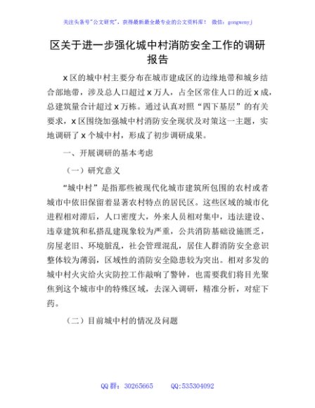 / 区进一步强化城中村消防安全工作的调研报告