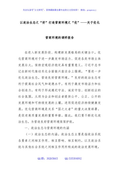 / 以政治生态之“好”打造营商环境之“优”——关于优化营商环境的调研报告