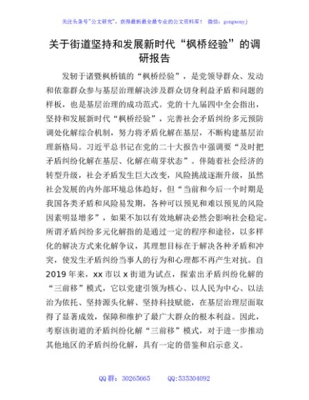/ 街道坚持和发展新时代“枫桥经验”的调研报告【www.zzgzrc.com】